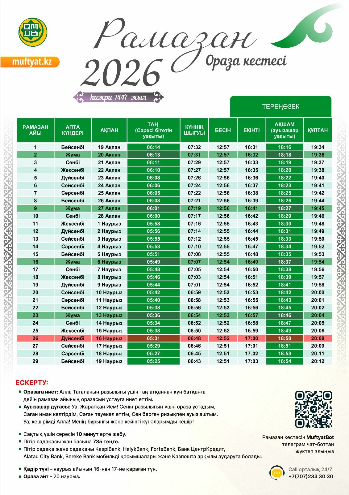 Алла Тағала алда келе жатқан қасиетті Рамазан айына аман-есен жеткізіп, ұстайтын оразамызды, жасайтын құлшылықтарымыз бен қайырымды істерімізді қабыл еткей! Елімізге тыныштық, отбасымызға береке беріп, айдан аман, жылдан есен өтуді баршамызға нәсіп етсін!